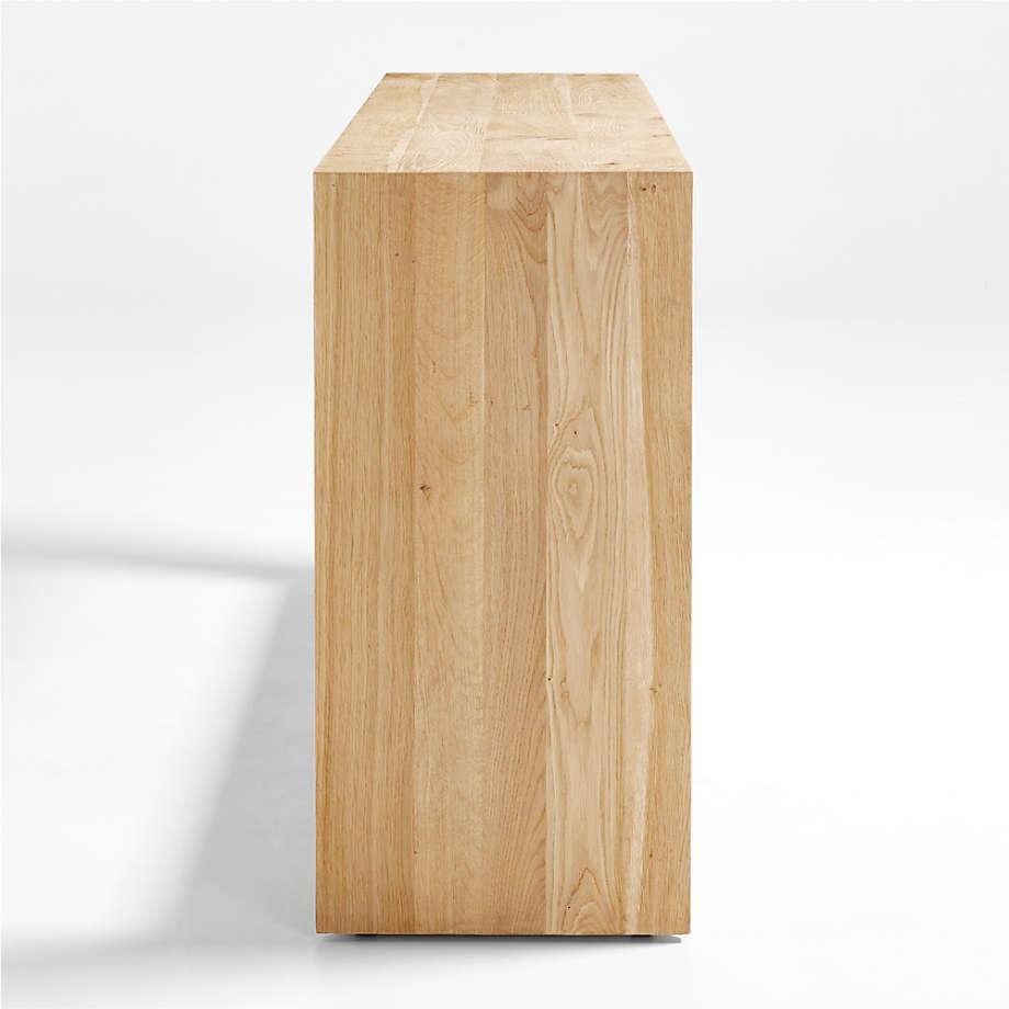 Named after the natural beauty found in the Baja Peninsula, this large console table celebrates the organic richness of white oak. The table uses simple geometry and a natural finish to put the focus on the wood's unique grain, knots and markings. Reverse chamfer edges open up the clean waterfall silhouette, drawing the eye inward toward the low, full-length shelf. Rustic and timeless, the Baja oak console table is a Crate & Barrel exclusive.