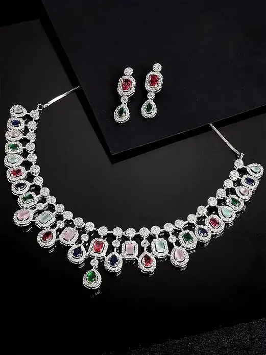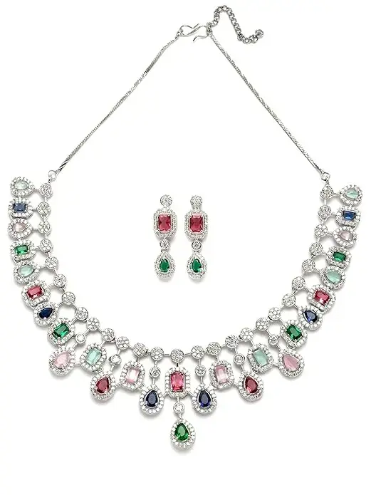 Karatcart Silver Tone Multicolor Cubic Zirconia Studded Necklace Set. Our products are designed with high-quality material and these products are enhanced with plating that are skin-friendly & with love to reach your heart.