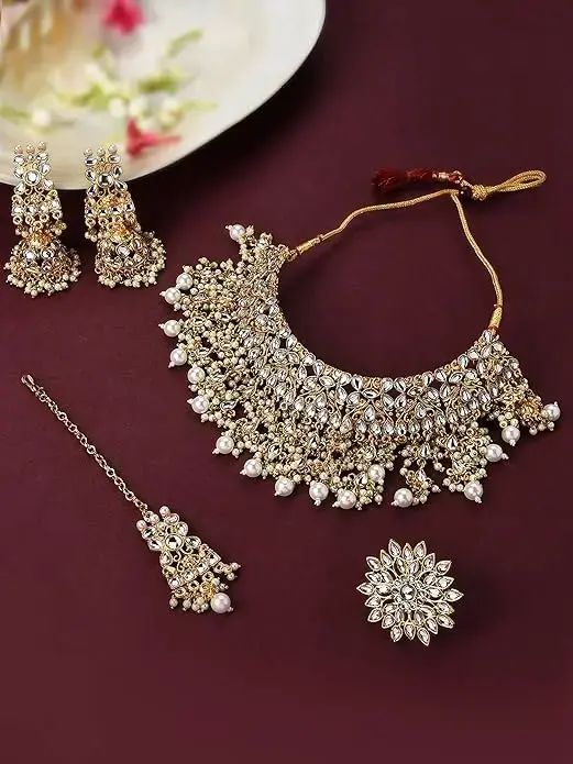 Step into regal elegance with this luxurious gold-tone Kundan jewellery set from Zaveri Pearls. This all-in-one set includes a beautifully crafted choker necklace, matching earrings, a traditional Maangtikka, and a coordinating ring — all adorned with intricate Kundan detailing. Designed to add royal charm to your bridal or festive ensemble, it pairs perfectly with lehengas, sarees, and anarkalis. A statement-making set that brings heritage style and grace to any celebration.