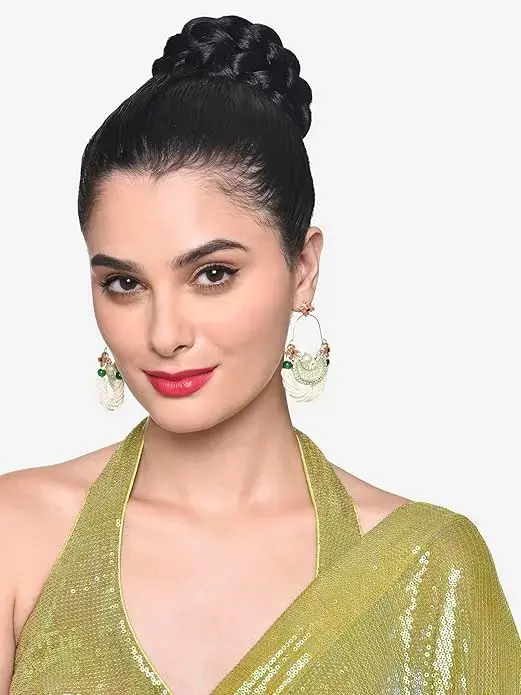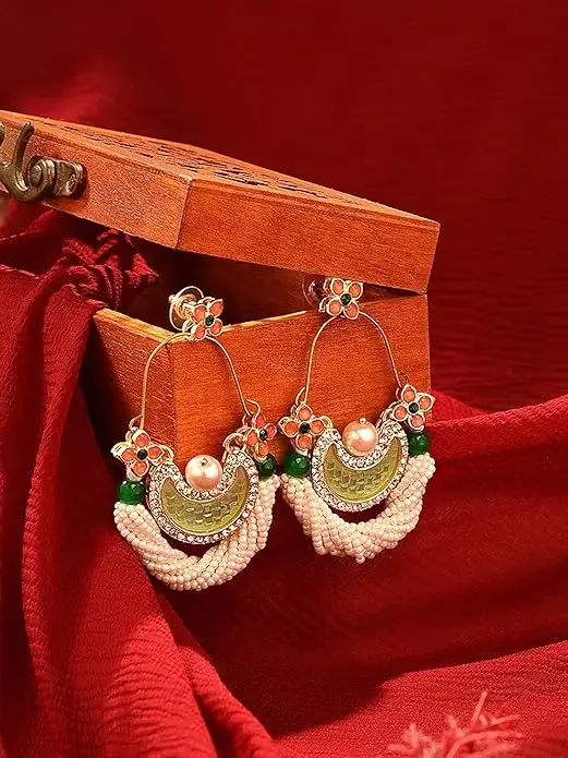 Make a dazzling impression with these stunning crescent-shaped ethnic dangle earrings from Zaveri Pearls. Adorned with green and peach sparkling stones, these earrings offer a perfect mix of traditional charm and festive glam. The intricate design and vibrant colors make them ideal for weddings, festive events, or cultural celebrations. Lightweight and eye-catching, they pair beautifully with sarees, lehengas, and anarkalis to complete your ethnic look.
