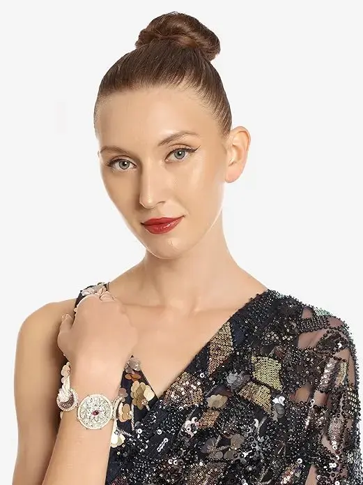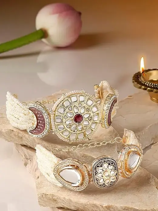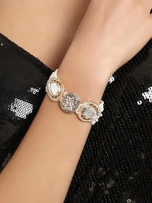 Enhance your ethnic style with this beautiful set of 2 bracelets from Zaveri Pearls, featuring a stunning combination of multicolour enamel work, intricate Kundan detailing, and delicate bead strands. Highlighted by a dazzling crescent charm design, these bracelets bring together tradition and modern flair, perfect for festive occasions, weddings, and celebrations. Whether worn as a pair or individually, they add a graceful sparkle to your wrists and complete your ethnic ensemble with elegance.