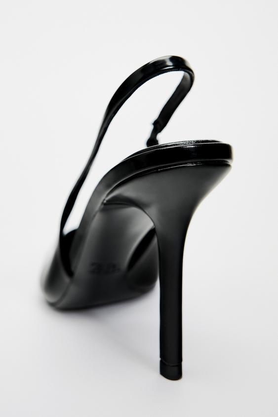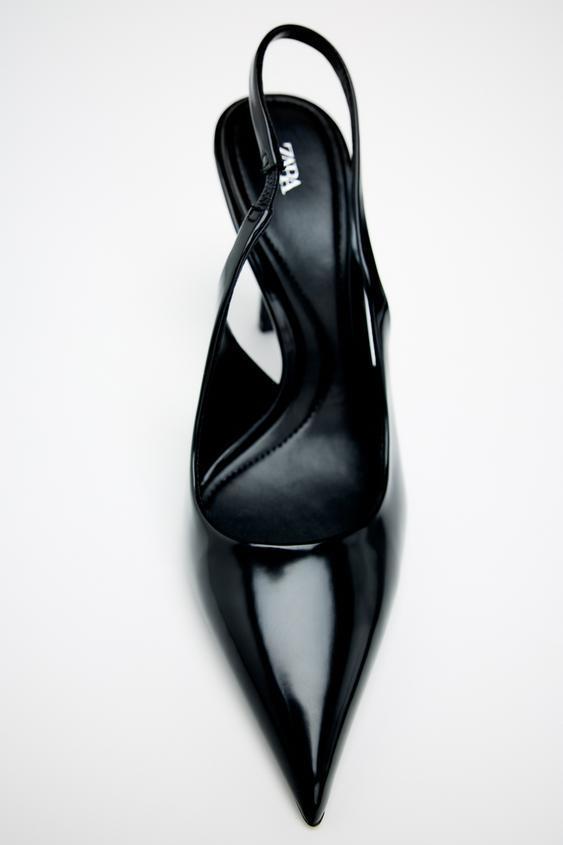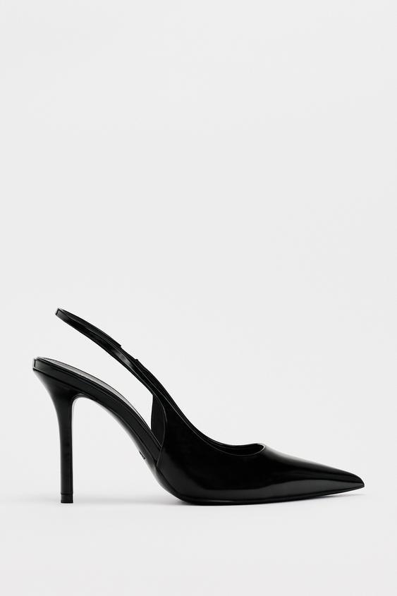 High-heel slingback shoes with a patent effect. Pointed toe.